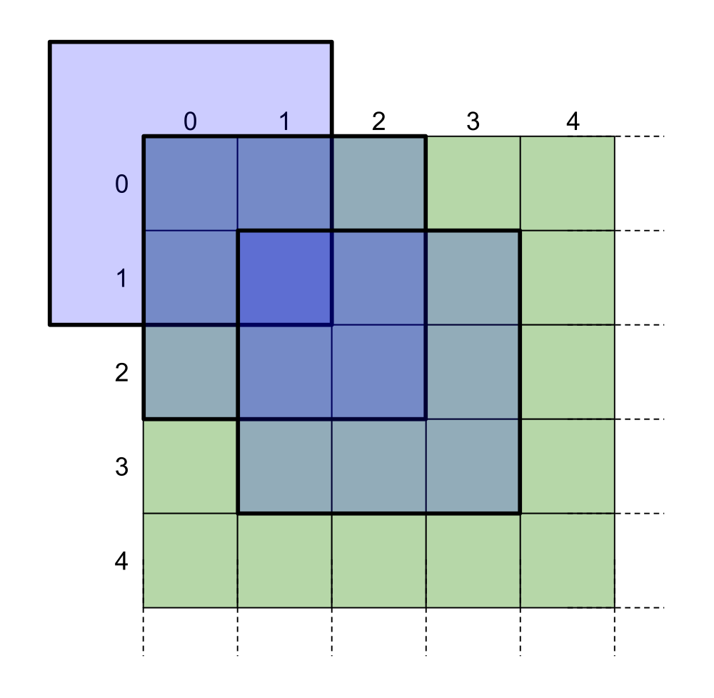 The first sample case is illustrated below. The blue squares each represent a machine activation. We can see that a total of 14 flowers within the garden were watered.